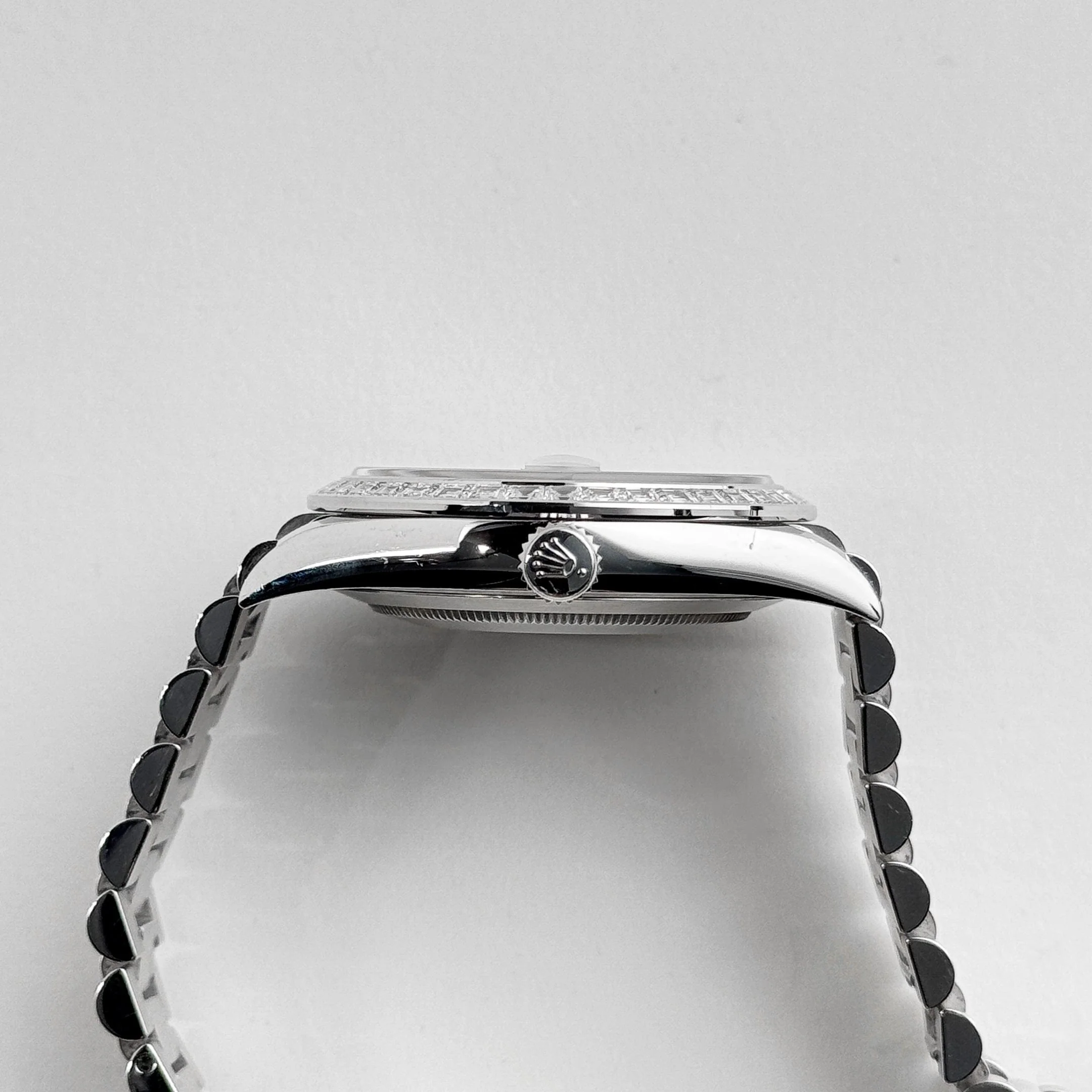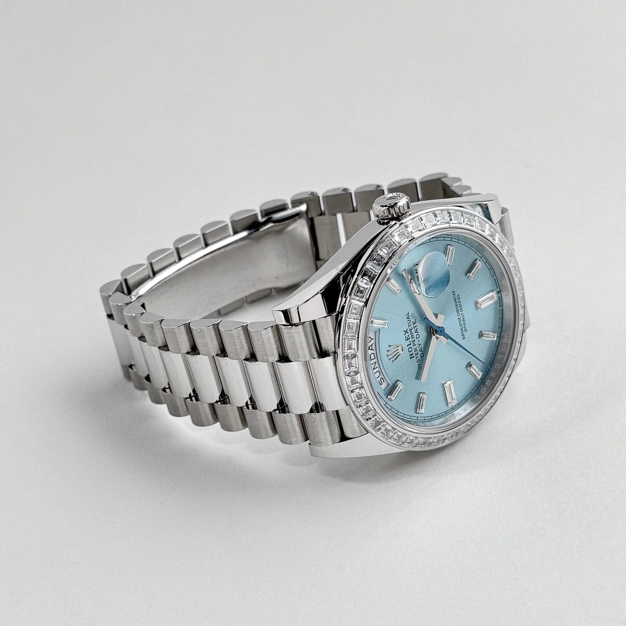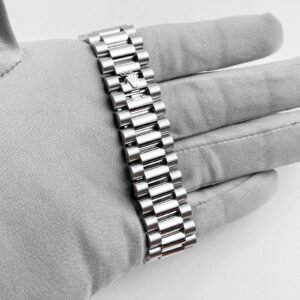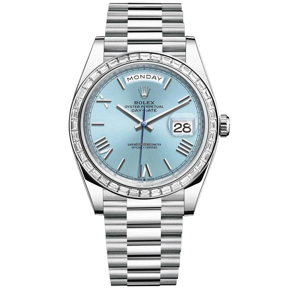 The standout feature is the mesmerizing ice blue dial, exclusive to Rolex platinum models, adorned with brilliant-cut diamond hour markers. The day window at 12 o’clock and date display at 3 o’clock seamlessly integrate functionality into the sophisticated design.